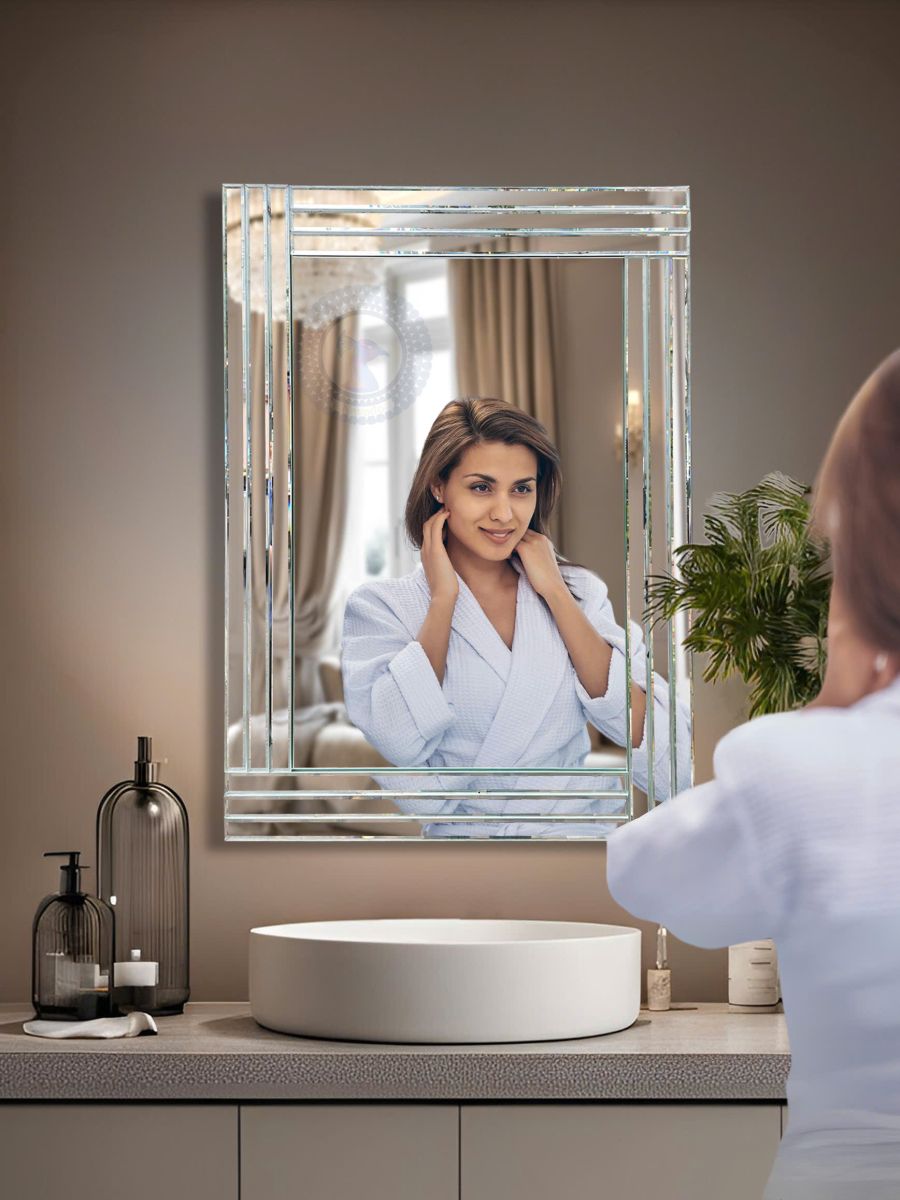 Luxury Mirror For Hotel Bathroom Project NAV 2129 brings a refined elegance to any hotel bathroom or upscale interior with its modern, layered frame design. Featuring a sophisticated arrangement of clean-cut beveled mirror strips, this piece reflects luxury from every angle while enhancing depth and dimension in the room.