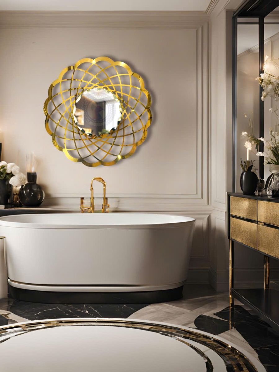 The Artistic Bloom Bathroom Mirror For Hotel Livingroom Projects elevates wall decor into fine art. Inspired by the overlapping symmetry of flower petals and sacred geometry, its radiant gold frame encircles the central mirror like a gilded mandala. This mirror transforms any wall into a gallery of sculptural elegance and opulent reflection.
