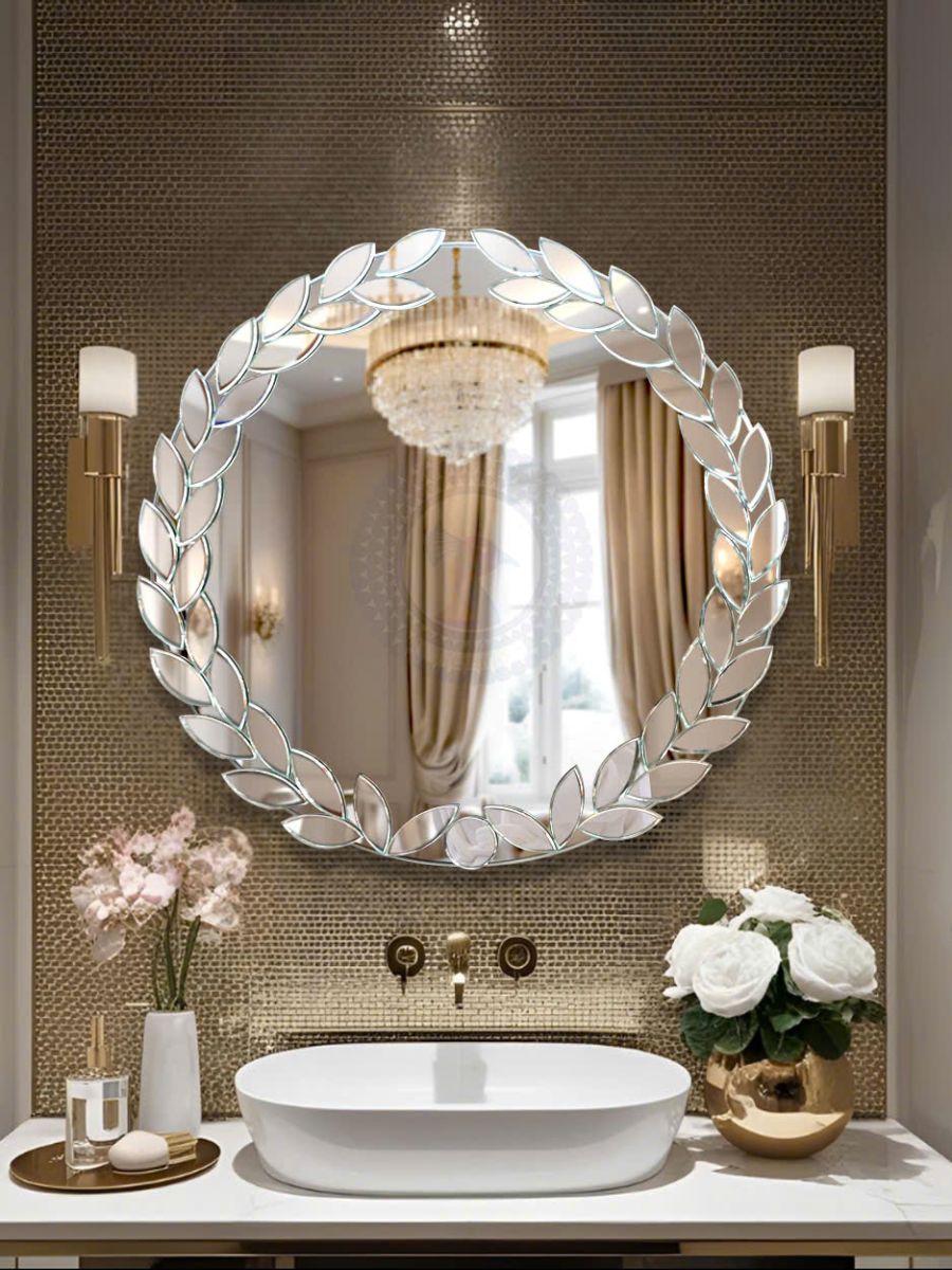 The Artistic Circle Bathroom Mirror Lauriel NAV 2051 For Hotel Bathroom Projects is inspired by the timeless symbolism of laurel wreaths—an ancient emblem of prestige, victory, and honor. This mirror reinvents that classical motif with a sculptural ring of mirrored leaves that delicately frame a crystal-clear circular mirror. Each leaf reflects and refracts light beautifully, evoking both serenity and sophistication.