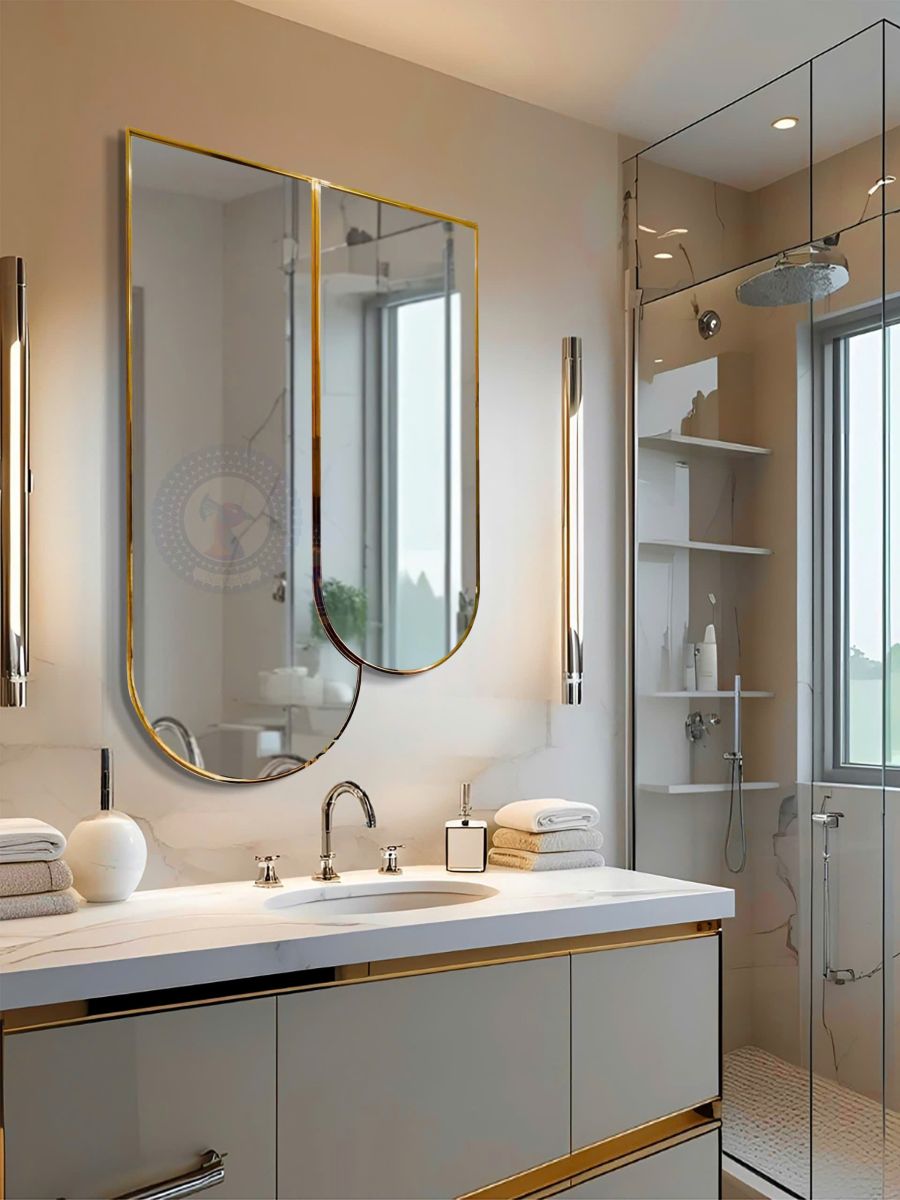 The Artistic Dual Curve Mirror For Hotel Bathroom Projects reimagines classic bathroom symmetry with a sleek, modern twist. Featuring two vertically aligned mirrors—each with a unique U-shaped lower contour—this design is both practical and artful. The mirrored pair is framed in slender gold trim that enhances the space with warmth and minimalist glamour.
