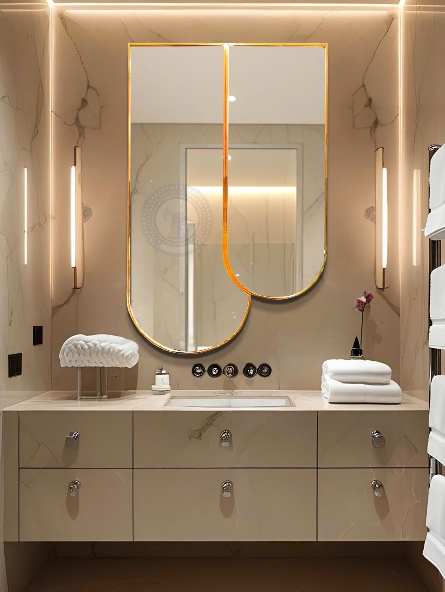 The Artistic Dual Curve Vanity Mirror For Hotel Bathroom Projects reimagines classic bathroom symmetry with a sleek, modern twist. Featuring two vertically aligned mirrors—each with a unique U-shaped lower contour—this design is both practical and artful. The mirrored pair is framed in slender gold trim that enhances the space with warmth and minimalist glamour.