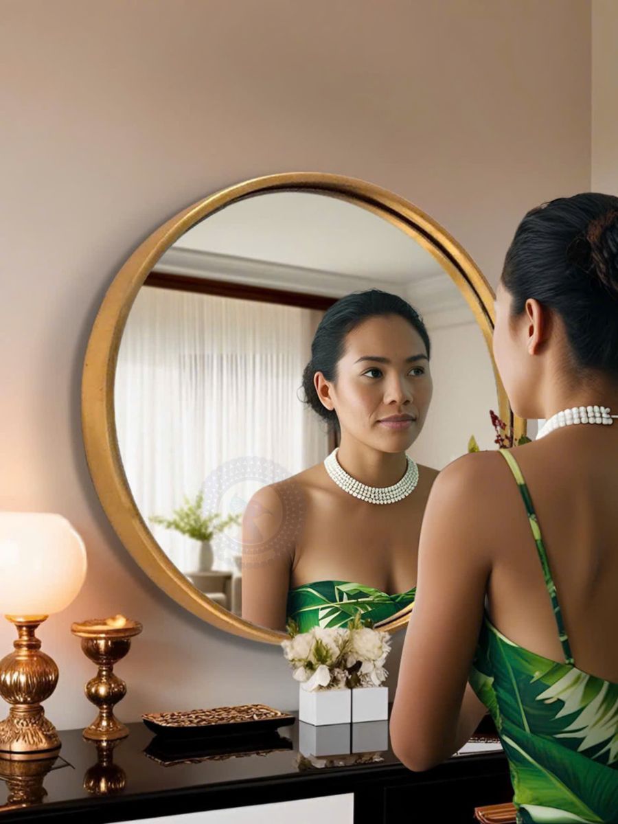 Its slim, brushed-gold rim adds just the right amount of glamour without overwhelming the space. This mirror becomes a natural focal point in entryways, dressing areas, or hotel lobbies, offering a harmonious balance between utility and design refinement.