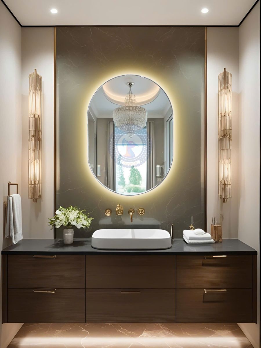 Crafted with the needs of luxury hotels and interior designers in mind, this oval mirror is more than just a reflective surface — it's a statement of elegance. It complements marble countertops, metallic fixtures, and moody accent walls, as seen in high-end hospitality environments.