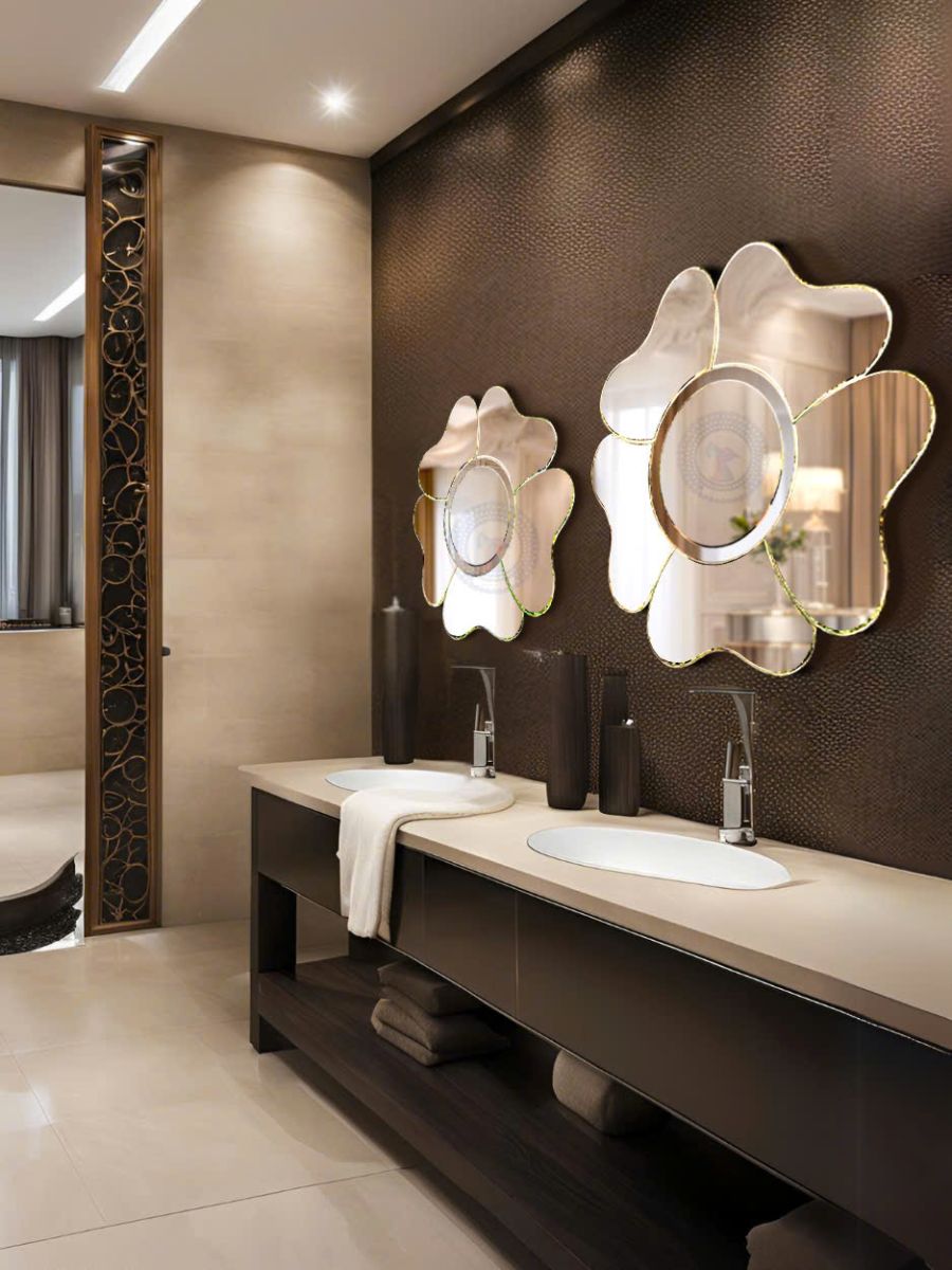 The Artistic Mirror Sorrel NAV 2133 For Hotel Bathroom Projects brings playful sophistication to modern bathrooms with its petal-shaped mirror design. Inspired by blooming flora, each petal-like contour curves gracefully around a circular central mirror, creating a fresh and radiant statement piece. This is not just a mirror—it’s a visual celebration of organic form and artistic intent.