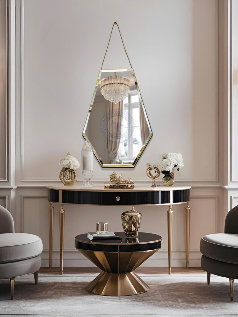 Placed above a black lacquered vanity or console table — as shown — it harmonizes effortlessly with metallic accents, velvet textures, or wood paneling, offering endless styling possibilities.