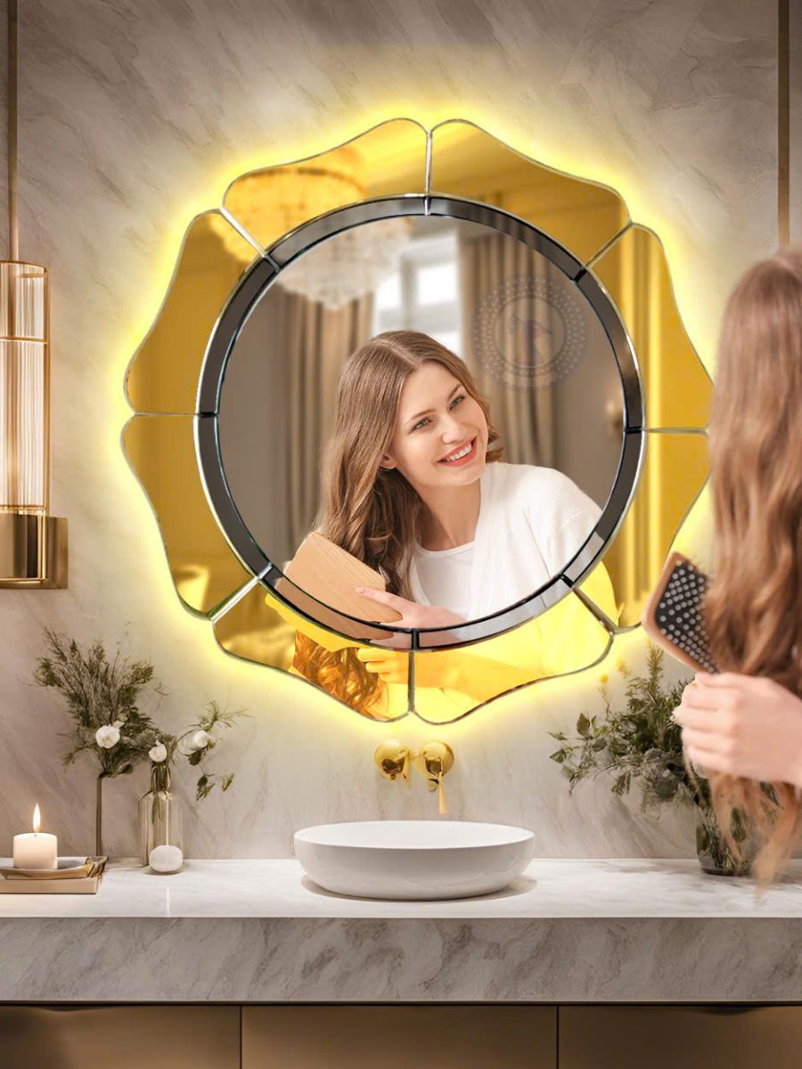 Inspired by the delicate shape of a blooming flower, Artistic LED Mirror For Hotel Bathroom Project Gerber NAV 6001 is a luminous centerpiece that exudes grace and innovation. This mirror is framed with gold-tinted petals radiating around a central circular pane, enhanced by integrated warm LED lighting that casts a soft, ambient glow.