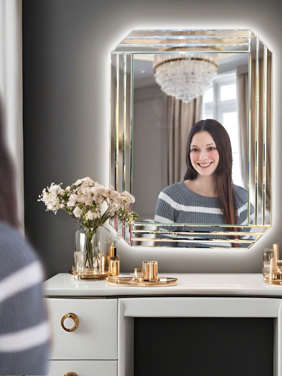 Integrated with soft backlit LED illumination, the mirror offers both functional lighting and atmospheric enhancement. Its faceted frame captures and reflects light from all angles, creating a subtle interplay between shadow and shine—perfect for upscale hospitality or executive spaces.