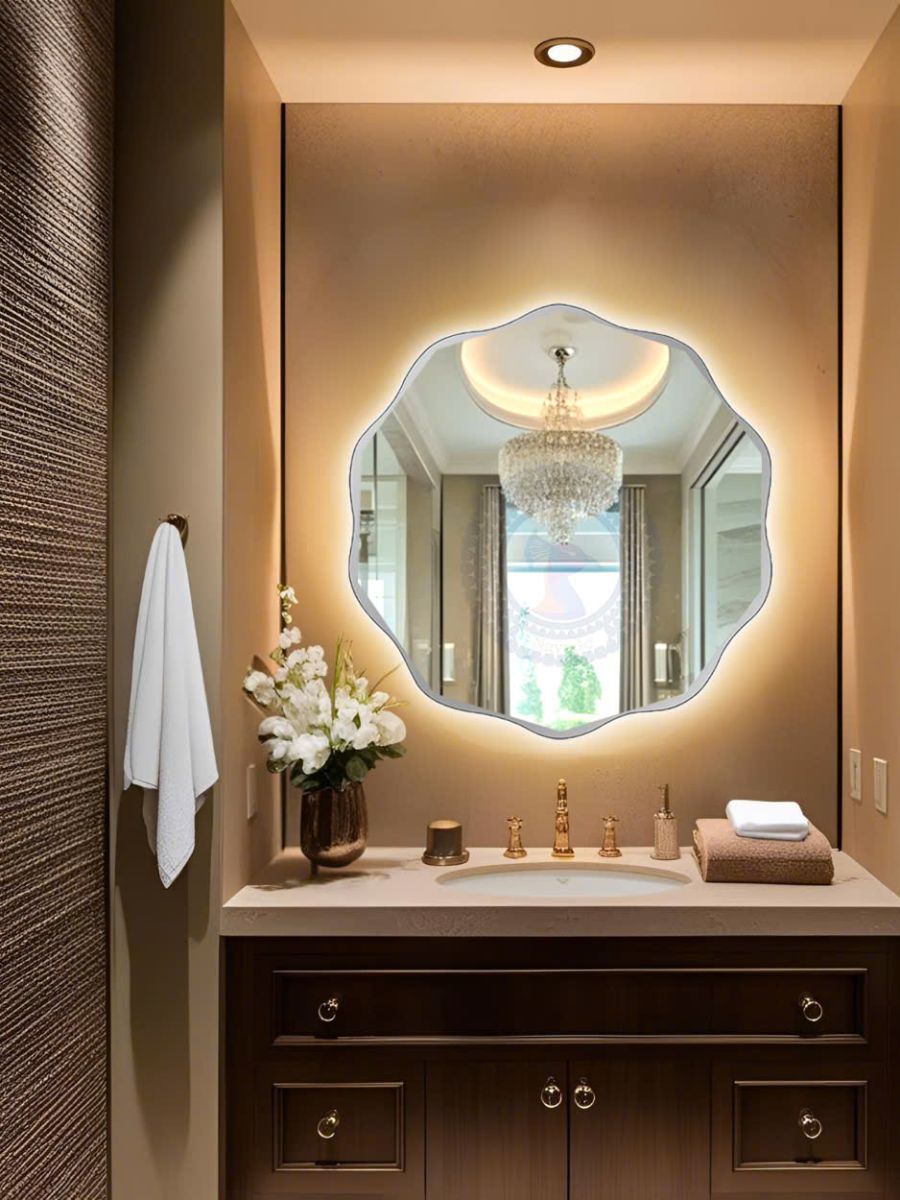 This LED Artistic Bathroom Mirror – Luxury Wall Mirror for Hotel Project is a refined expression of elegance and innovation, designed to enhance the most sophisticated bathroom interiors. Its soft, organically shaped silhouette brings a sense of calm and modern artistry, resembling delicate petals or flowing water—perfect for upscale hotels, boutique spas, or designer hotel/resort bathrooms.