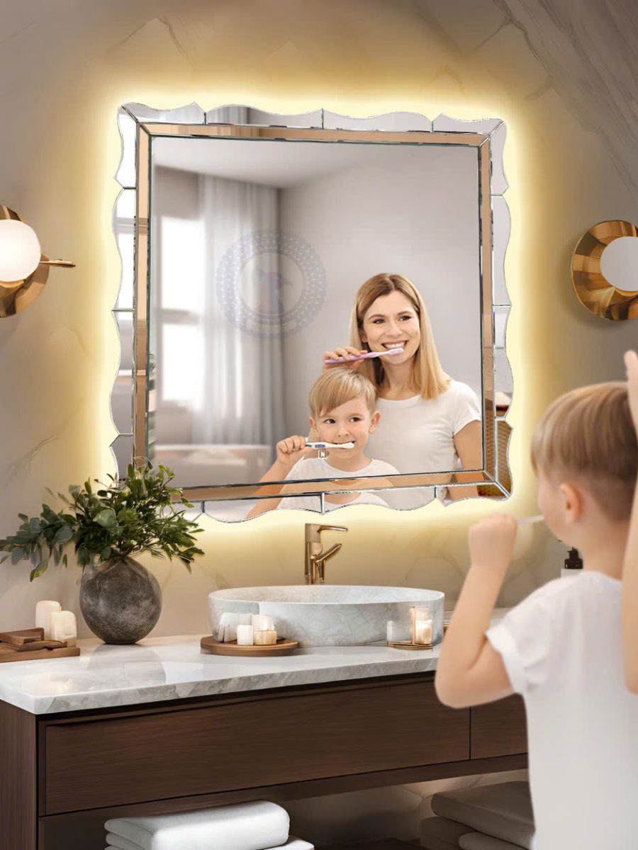 Artistic LED Mirror For Hotel Bathroom Project Anna NAV 6002B brings modern elegance into your space with its softly contoured square form and ambient backlighting. Its organic edge design subtly contrasts with the symmetrical square shape, offering a sophisticated balance between geometry and fluidity.