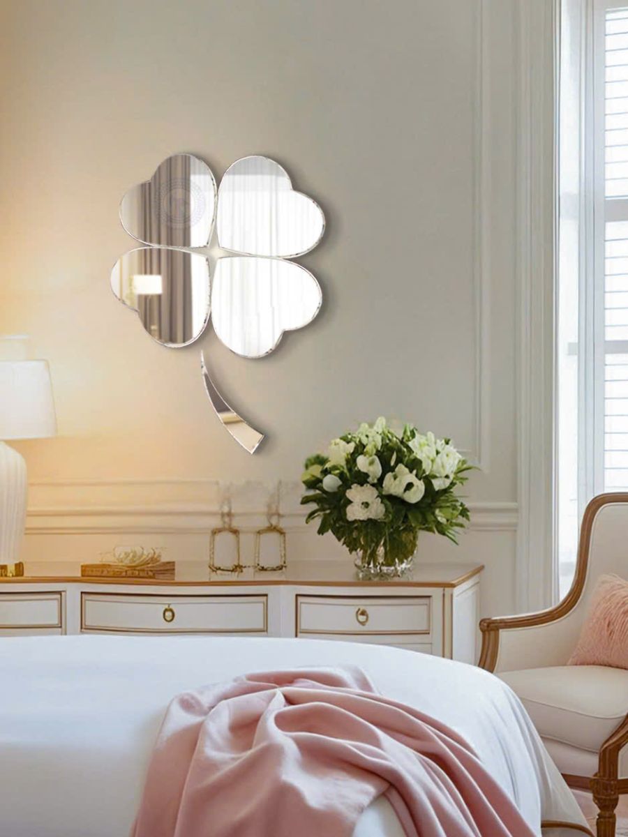 Celebrate harmony, hope, and good fortune with the Artistic Four-Leaf Decoration Mirror NAV 2140 For Hotel Livingroom Projects. This whimsical wall mirror takes the iconic shape of a four-leaf clover, reimagined in polished mirrored glass with smooth, rounded contours. Its distinctive stem completes the design, making it feel as though it bloomed right onto your wall.