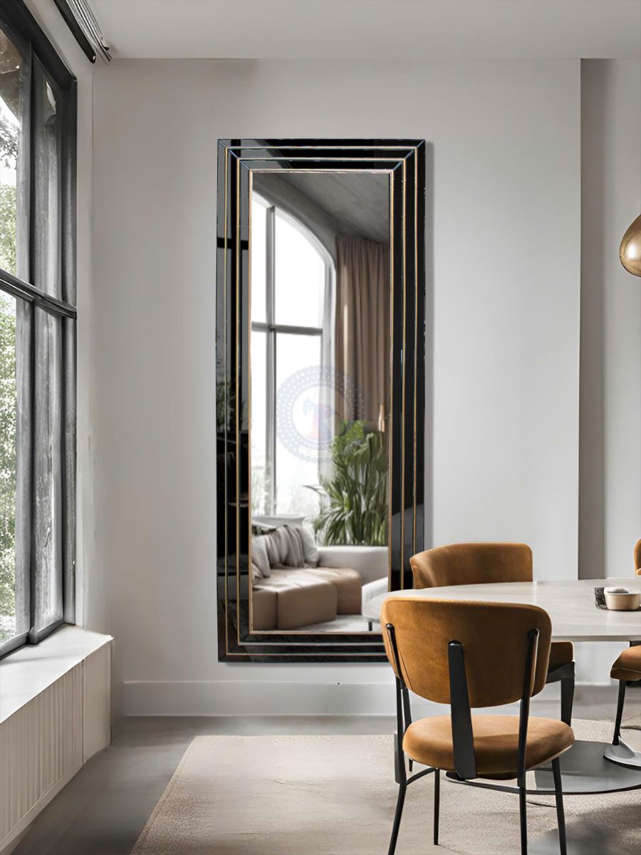 The Artistic Full-Length Decoration Mirror King Black NAV 2075 For Hotel Livingroom Projects is a full-length decorative mirror designed for interiors that demand presence and sophistication. Featuring a striking black mirrored frame with stepped beveling, this piece is both contemporary and commanding. Its large scale ensures it serves not just as a reflective surface, but also as a focal point in any room it adorns.