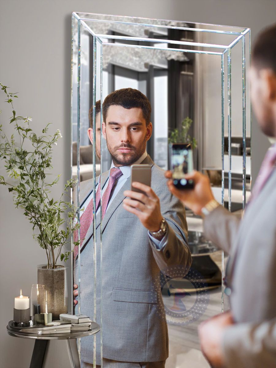 The Full-Length Decoration Mirror Omni NAV 2074 For Hotel Bedroom Projects is a bold yet refined statement of minimalist luxury. Crafted with clean lines and layered beveled edges, it creates a visual illusion of infinite depth—an architectural form that doubles as functional art.
