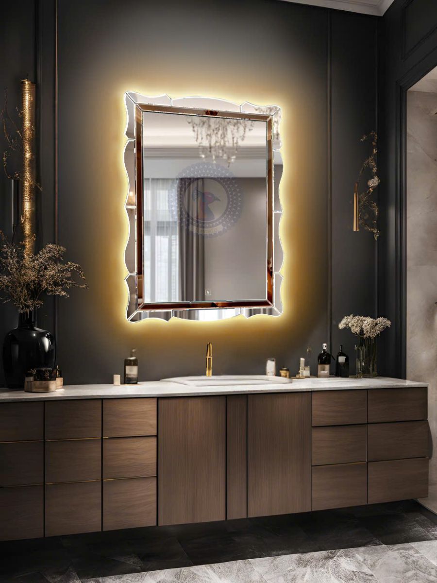 With its sculpted rectangular silhouette and glowing LED backlight, Artistic LED Mirror For Hotel Decoration Project Anna NAV 6002A is a refined statement piece for premium interiors. Its subtly contoured edges break the rigidity of traditional rectangular mirrors, while the warm backlit glow adds an ethereal ambiance to bathrooms, powder rooms, or hospitality suites.