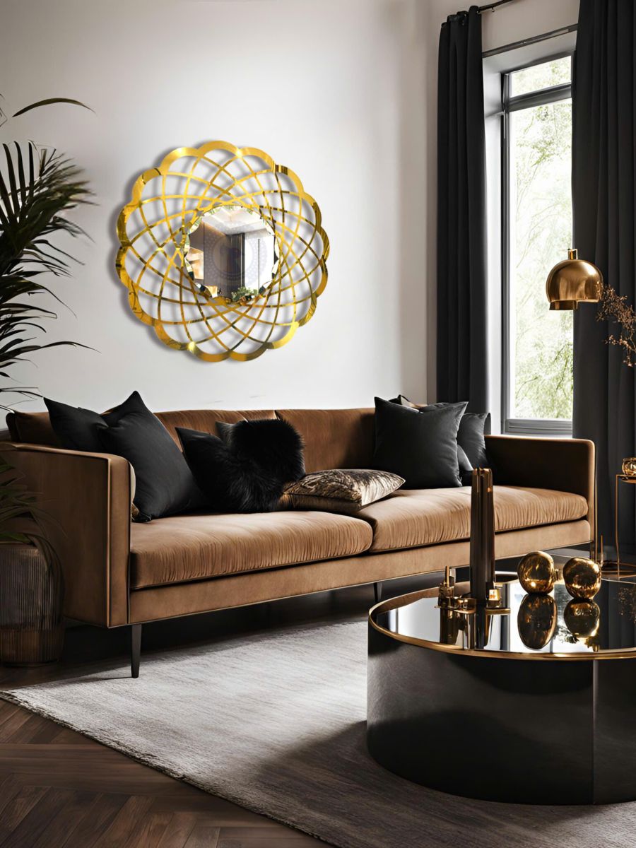 Crafted with precision laser-cut metal in a glowing gold finish, the mirror’s frame dances with light and depth. The central reflective panel maintains function while the frame commands artistic attention. Ideal for glamorous living rooms, chic hotel lobbies, or any space craving golden drama.
