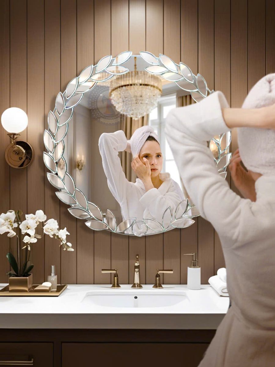 The Artistic Circle Mirror Lauriel NAV 2051 For Hotel Bathroom Projects is inspired by the timeless symbolism of laurel wreaths—an ancient emblem of prestige, victory, and honor. This mirror reinvents that classical motif with a sculptural ring of mirrored leaves that delicately frame a crystal-clear circular mirror. Each leaf reflects and refracts light beautifully, evoking both serenity and sophistication.