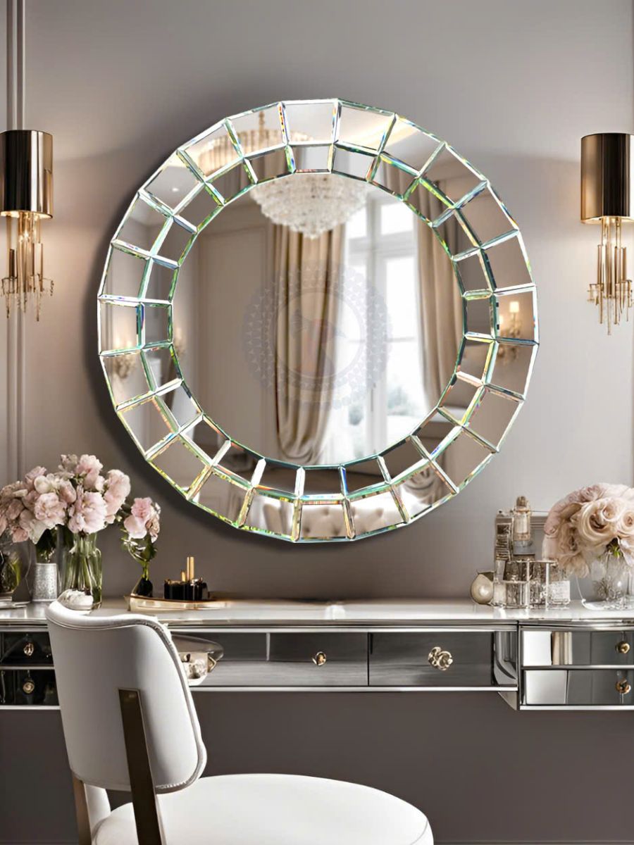 The Artistic Circle Mirror NAV 2098 For Hotel Livingroom Projects brings elegance and joy to your daily ritual. With its concentric design of faceted mirror tiles arranged like a crystal halo, this round mirror becomes a luminous centerpiece — ideal for vanity corners, powder rooms, or luxurious dressing spaces.