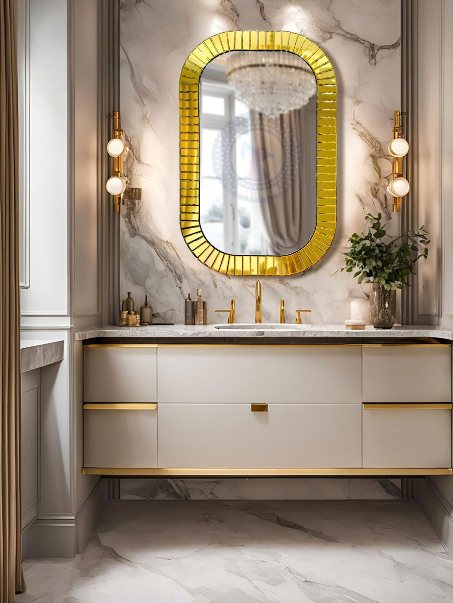 Its clear reflective core is distortion-free, ideal for both grooming and styling. The elongated vertical format and golden framing not only enhance visual height but also add an element of glamour and refinement to the wall it graces.
