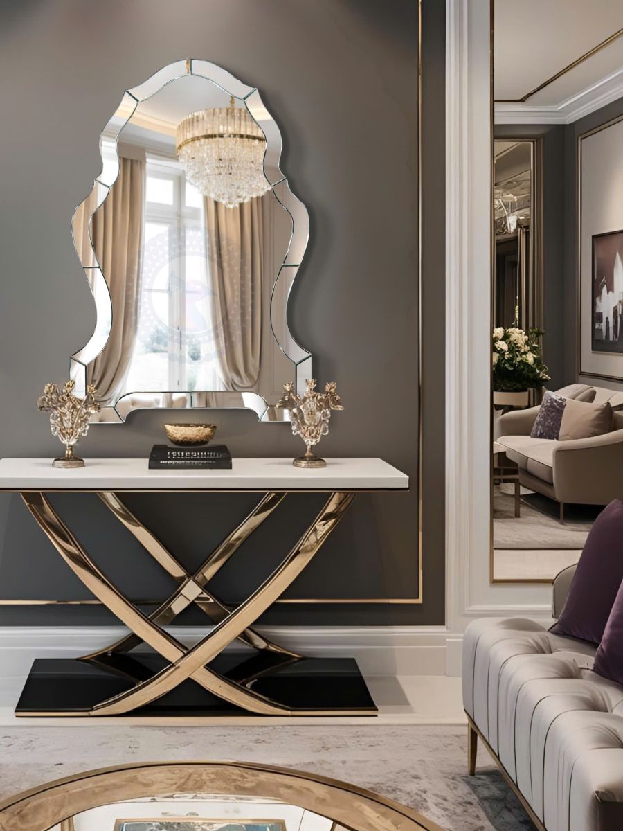 The Artistic Decoration Mirror NAV 2087 For Hotel Livingroom Projects reimagines traditional silhouette mirrors with sweeping curves and scalloped contours, bordered by precision-cut mirrored segments. Its fluid lines evoke the grace of flowing fabric or the contours of a Baroque frame, making it a poetic centerpiece for sophisticated interiors.