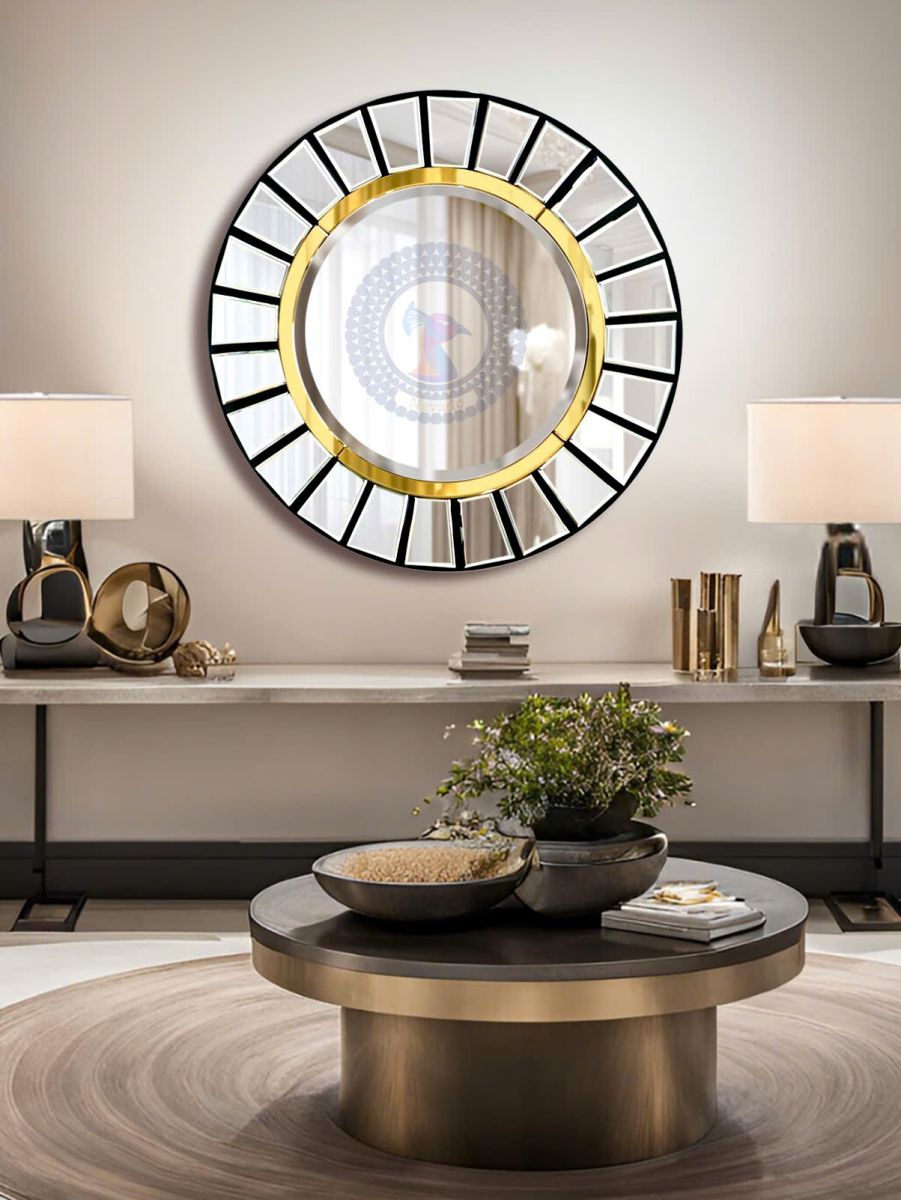 The Artistic Golden Frame Mirror Edgar NAV 2150D For Hotel Living Room Projects is a striking round wall mirror that blends classic elegance with modern geometry. Its bold frame features segmented mirrored panels arranged like sun rays, encircling a golden ring that accentuates the central reflective surface. This luxurious detail lends the mirror an almost celestial aura—making it the perfect blend of vintage charm and contemporary polish.
