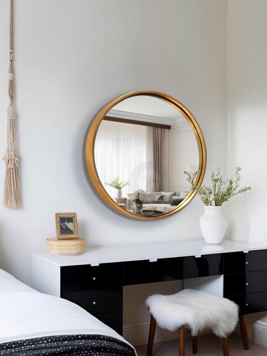 The clean circular silhouette and warm metallic tone allow this mirror to complement a variety of design styles—from modern classic to art deco to minimalist. It pairs effortlessly with black lacquered consoles, velvet seating, or marble surfaces.
