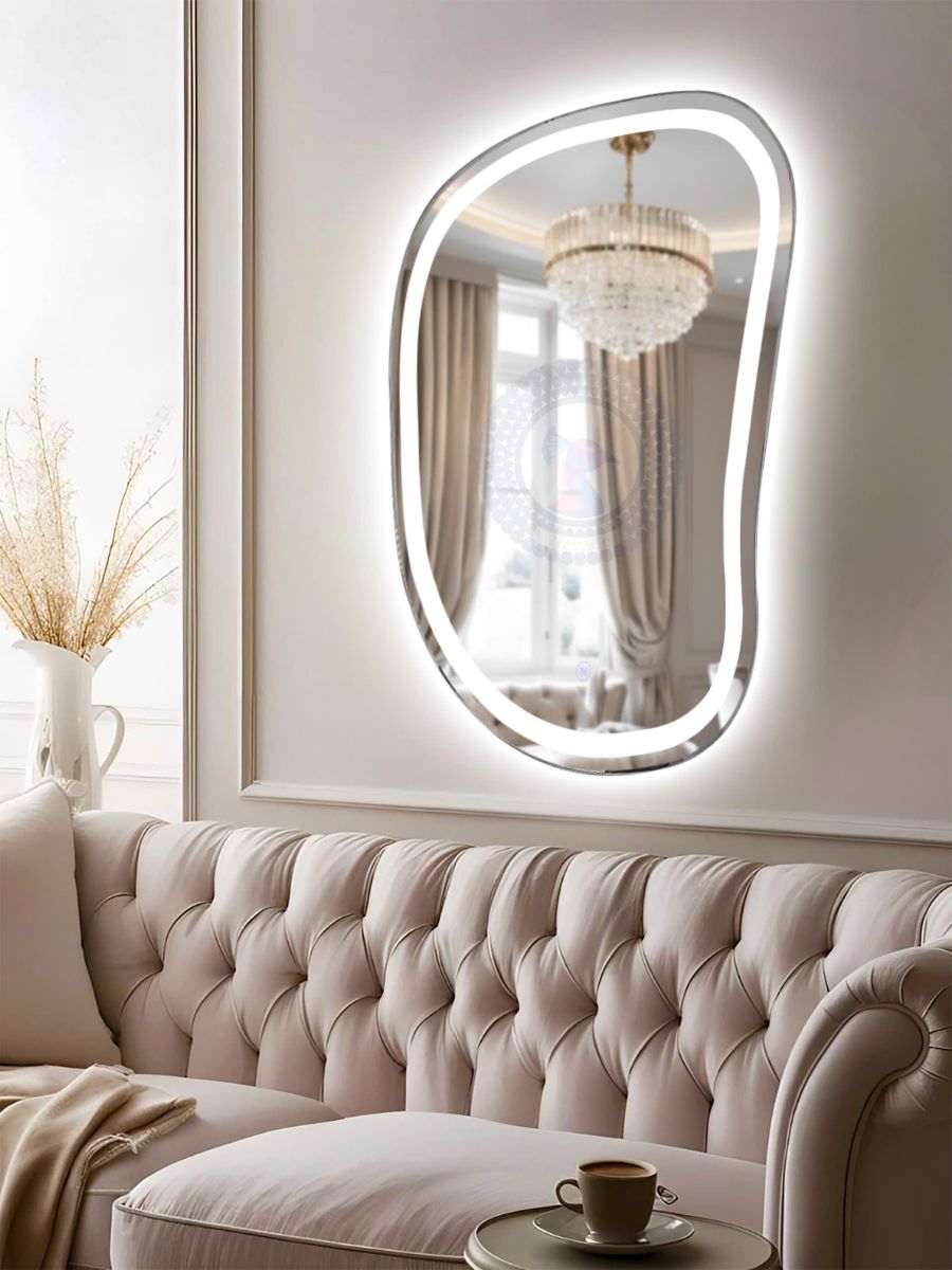 The Artistic Illuminated Organic LED Mirror For Hotel Bedroom Projects brings modern calm to your personal space. With its asymmetrical, fluid silhouette and integrated LED lighting, this mirror offers a perfect balance between form and function. Mounted above a vanity or console, it adds artistic energy while softly illuminating the room.