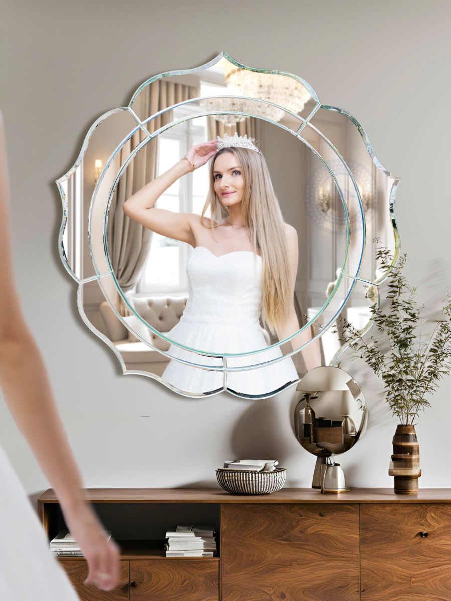 Crafted with precision beveled glass panels, Anna’s intricate petal-shaped form evokes harmony and sophistication. The center round mirror is surrounded by a mirrored border that adds depth and shine, making the piece both functional and artistic.