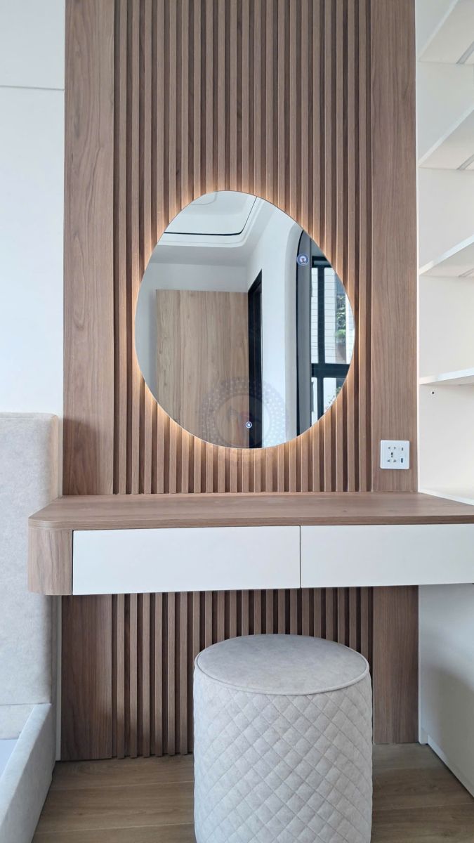 This piece is both mirror and art object, designed to complement serene dressing corners, minimalist bedrooms, or wellness-inspired hospitality suites.