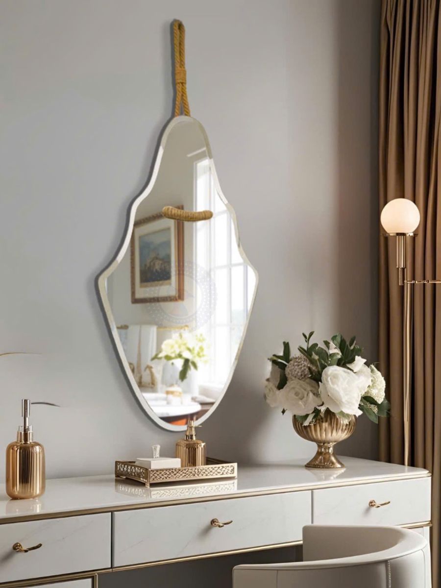 The Artistic Mirror Hilton NAV 304 For Hotel Livingroom Projects is a celebration of relaxed luxury and artisanal design. Its softly curved, asymmetrical form draws inspiration from organic shapes found in nature, while the suspended rope adds a charming, tactile contrast to its reflective elegance. This mirror doesn’t just hang on the wall — it makes a statement.