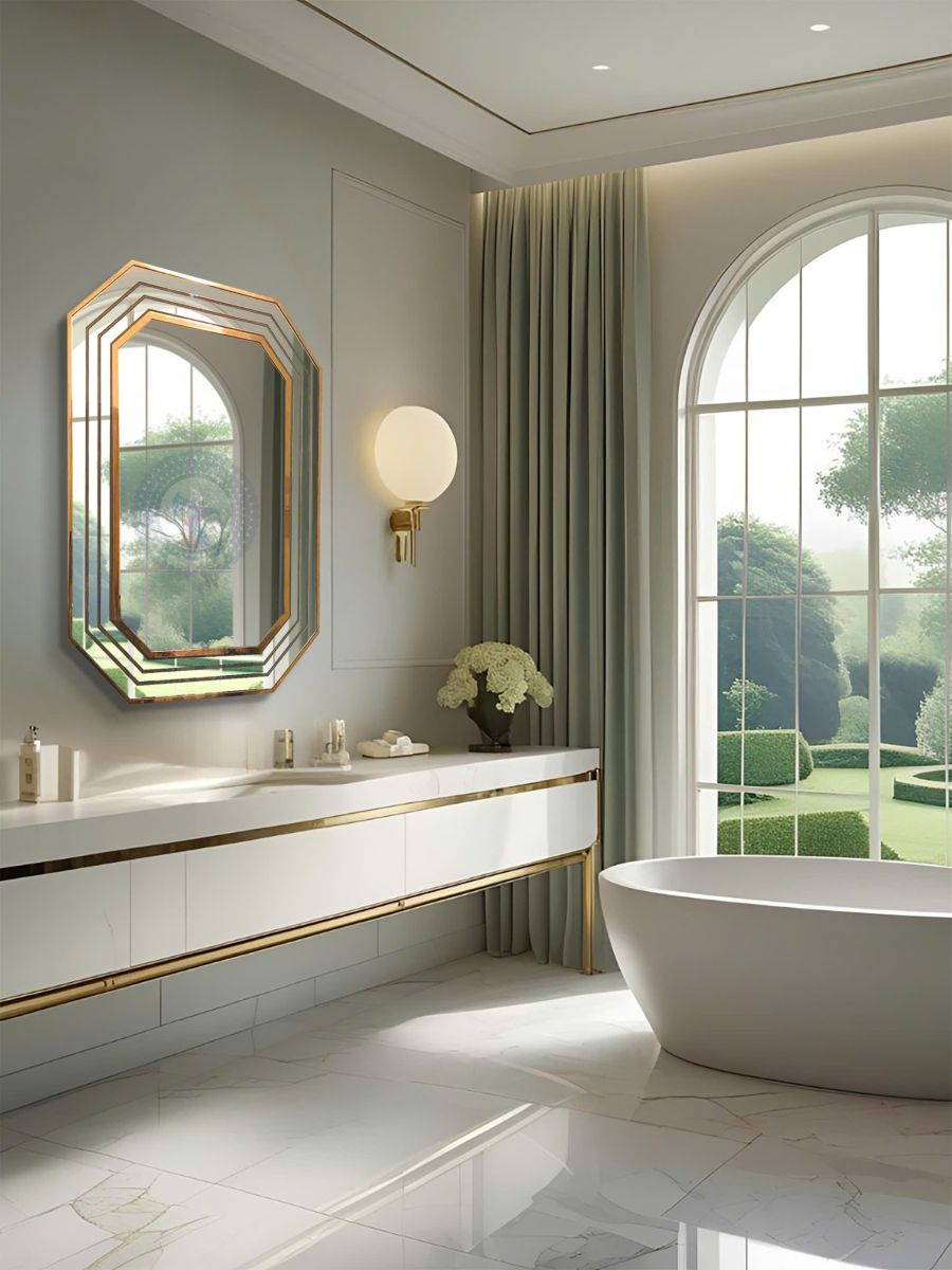 The mirror’s faceted frame plays with depth and perspective, while the gold trim and tiered layout evoke classic Art Deco influences. Embedded LED lighting provides subtle radiance without overshadowing the mirror’s sleek structure—ideal for day-to-night elegance.