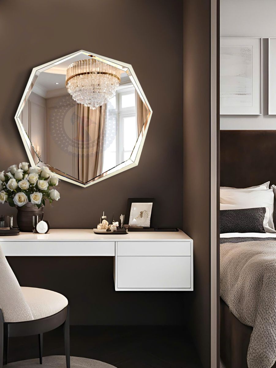 With a sculptural silhouette and expertly crafted mirrored frame, this octagonal design is both modern and timeless. It transforms a simple wall into a curated visual feature, whether placed in a boutique hotel suite, luxury powder room, or residential dressing area.