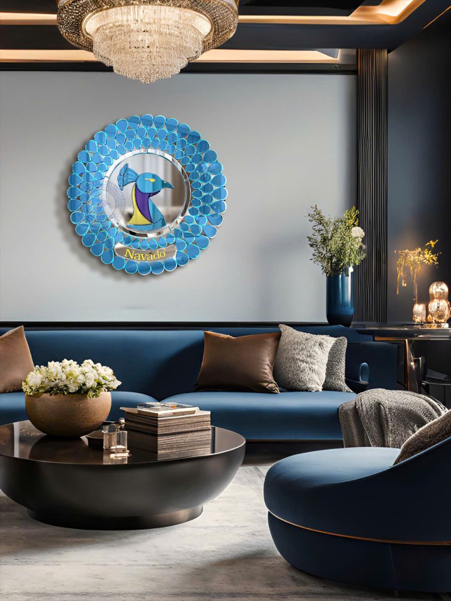 The Artistic Peacock Mirror NAV 2042 For Hotel Livingroom Projects captures the beauty of one of nature’s most regal creatures — the peacock — through a stunning circular mosaic of vibrant blue mirror segments. Designed to evoke the shimmering fan of a peacock's tail, this mirror is more than décor — it’s a centerpiece of color, culture, and conversation.