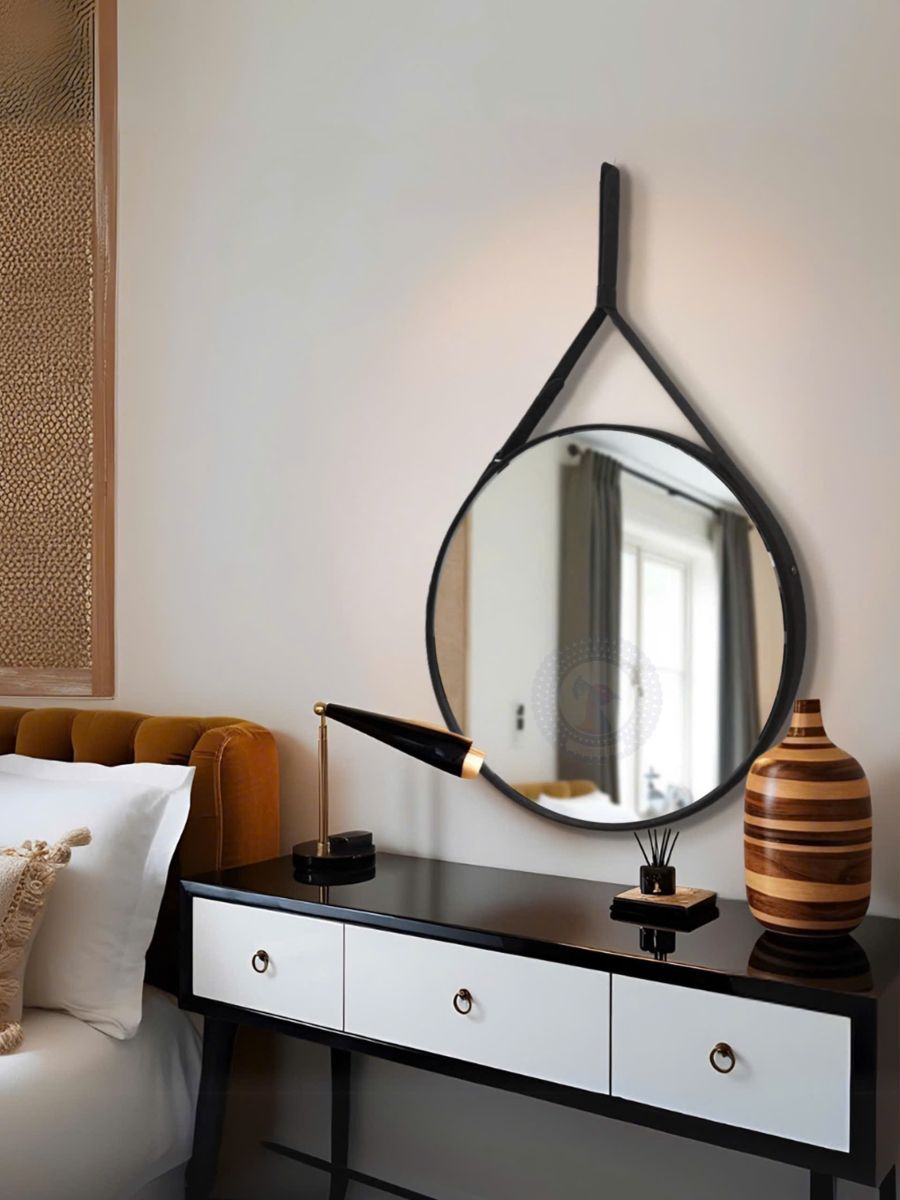 The Artistic Round Wall Decoration Mirror For Hotel Bedroom Projects NAV 909A is the epitome of sleek, practical design tailored for the modern lifestyle. With a crisp circular silhouette framed in matte black, this piece seamlessly integrates into contemporary and transitional décor. What sets it apart is the distinctive top-mounted hanging strap—a smart and stylish alternative to traditional mounting, offering both ease and design flair.