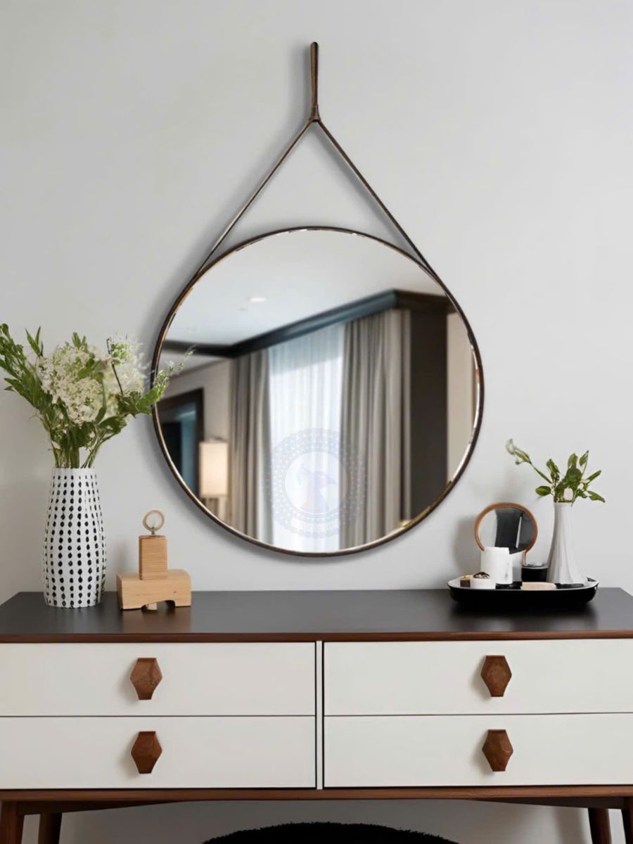 The Artistic Round Wall Decoration Mirror For Hotel Bedroom Projects NAV 909A4 is the epitome of sleek, practical design tailored for the modern lifestyle. With a crisp circular silhouette framed in matte black, this piece seamlessly integrates into contemporary and transitional décor. What sets it apart is the distinctive top-mounted hanging strap—a smart and stylish alternative to traditional mounting, offering both ease and design flair.