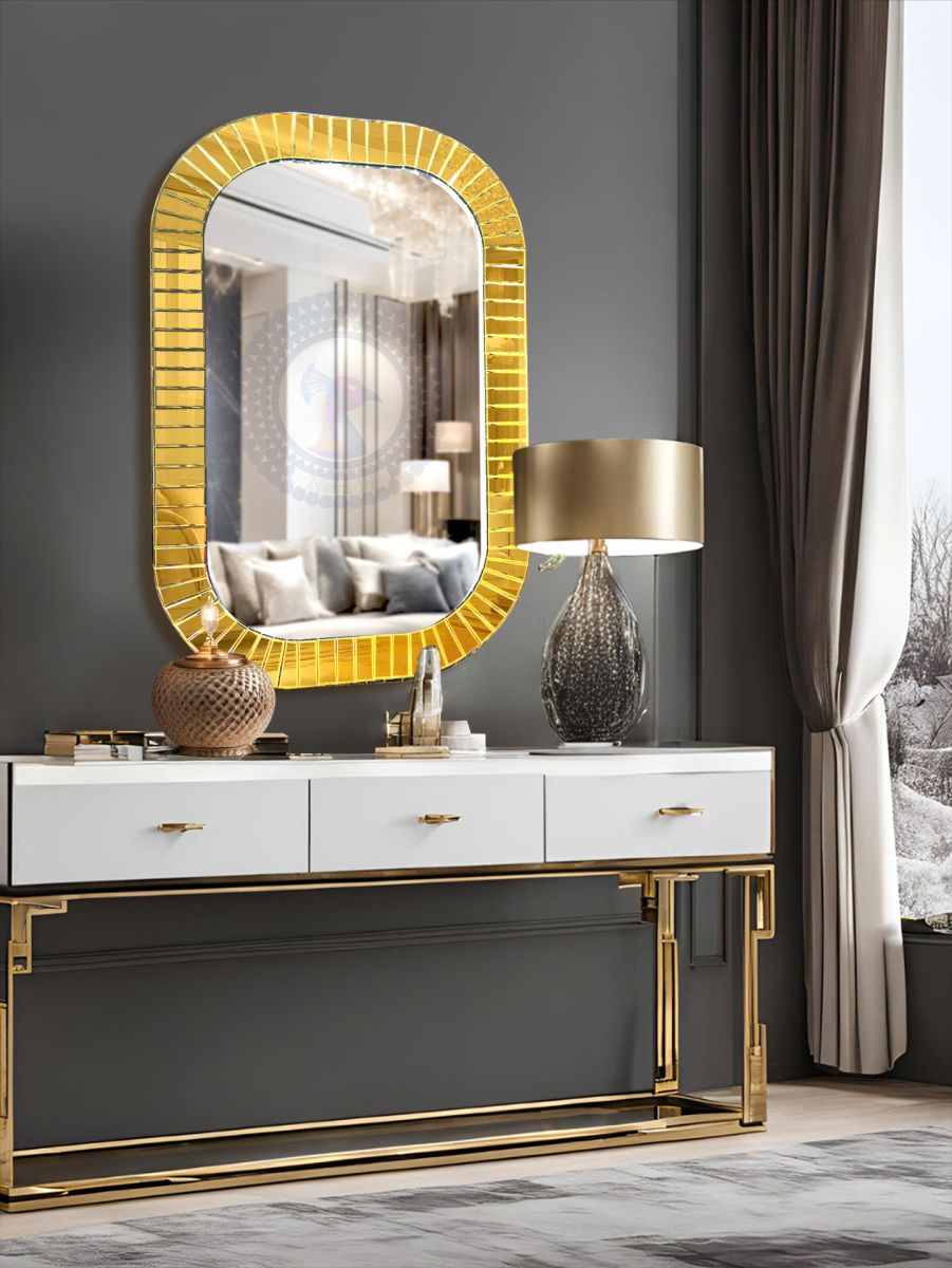 What sets the Artistic Vanity Mirror Motana NAV 2003 For Hotel Bedroom Projects apart is its frame—crafted from narrow, hand-cut golden glass segments, beveled to create a rhythmic, almost mosaic-like texture. These segments catch and scatter light beautifully, mimicking the visual richness of metallic sculpture.