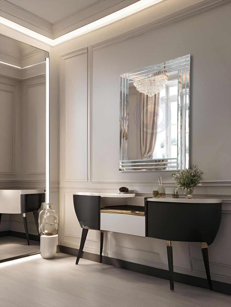 Luxury Mirror For Hotel Bedroom Project NAV 2129 brings a refined elegance to any hotel bedroom or upscale interior with its modern, layered frame design. Featuring a sophisticated arrangement of clean-cut beveled mirror strips, this piece reflects luxury from every angle while enhancing depth and dimension in the room.