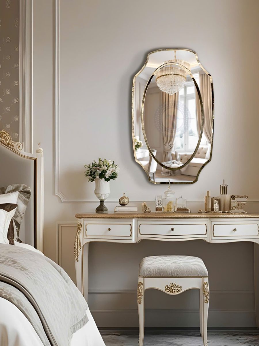 Crafted to complement refined interiors, this mirror is a natural match for ornate furniture, intricate wall mouldings, and romantic bedroom designs. Its golden undertones and soft reflective surfaces harmonize beautifully with neutral palettes, rich textures, and gilded accents.