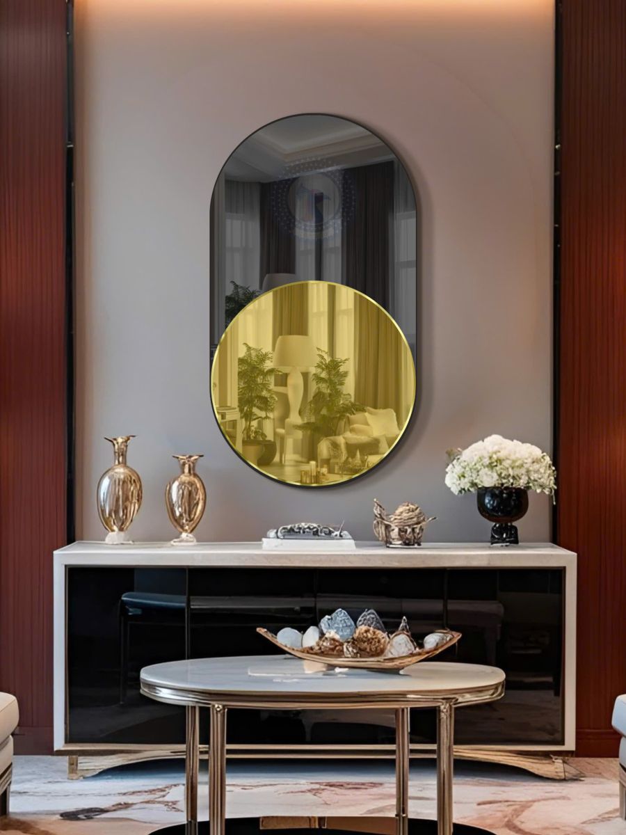 Design: Arched mirror with split-tone (black and gold) mirrored surface