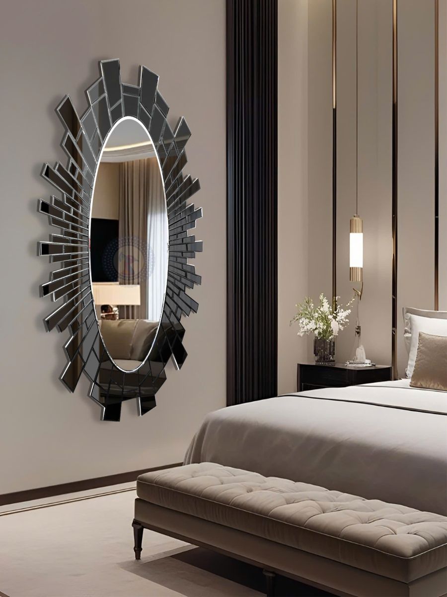 Unapologetically bold, the Full-Length Oval Mirror For Hotel Bedroom Projects is more than just a reflective surface—it’s a design centerpiece. Featuring a dramatic frame composed of black mirror tiles arranged in a radiating geometric pattern, this piece draws the eye and commands attention in any setting.