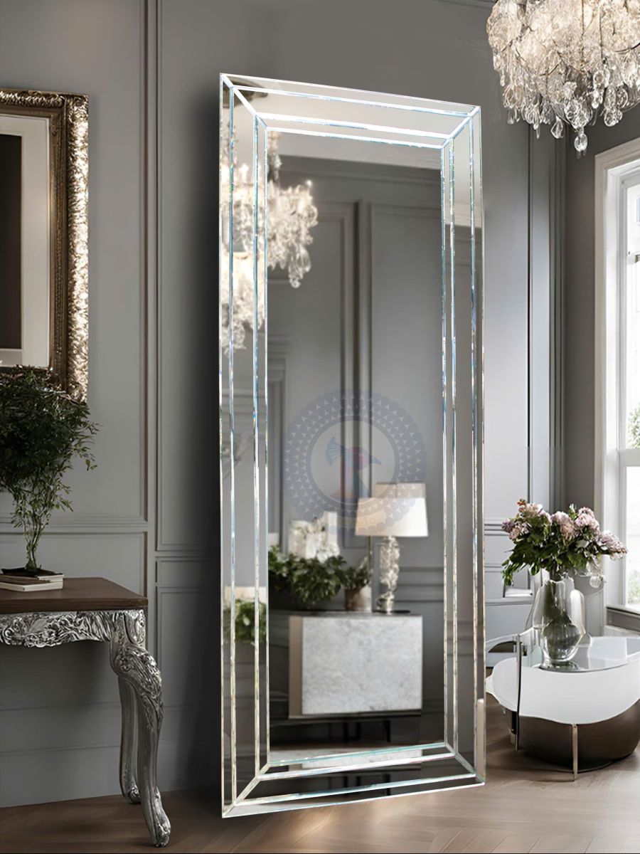 Its tall silhouette elongates interiors while brightening them through its highly reflective clarity. Ideal for modern bedrooms, chic dressing spaces, or luxury hospitality design.