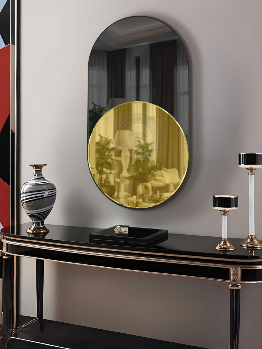 Luxury Artistic Mirror For Hotel Bedroom Project NAV 2144 is a bold statement of modern luxury. Featuring an elongated oval shape and a dual-tone mirror design, this piece plays with contrast through its sophisticated matte smoked glass upper half and radiant golden lower half. The result is an avant-garde aesthetic that captures both artistic expression and sleek elegance.