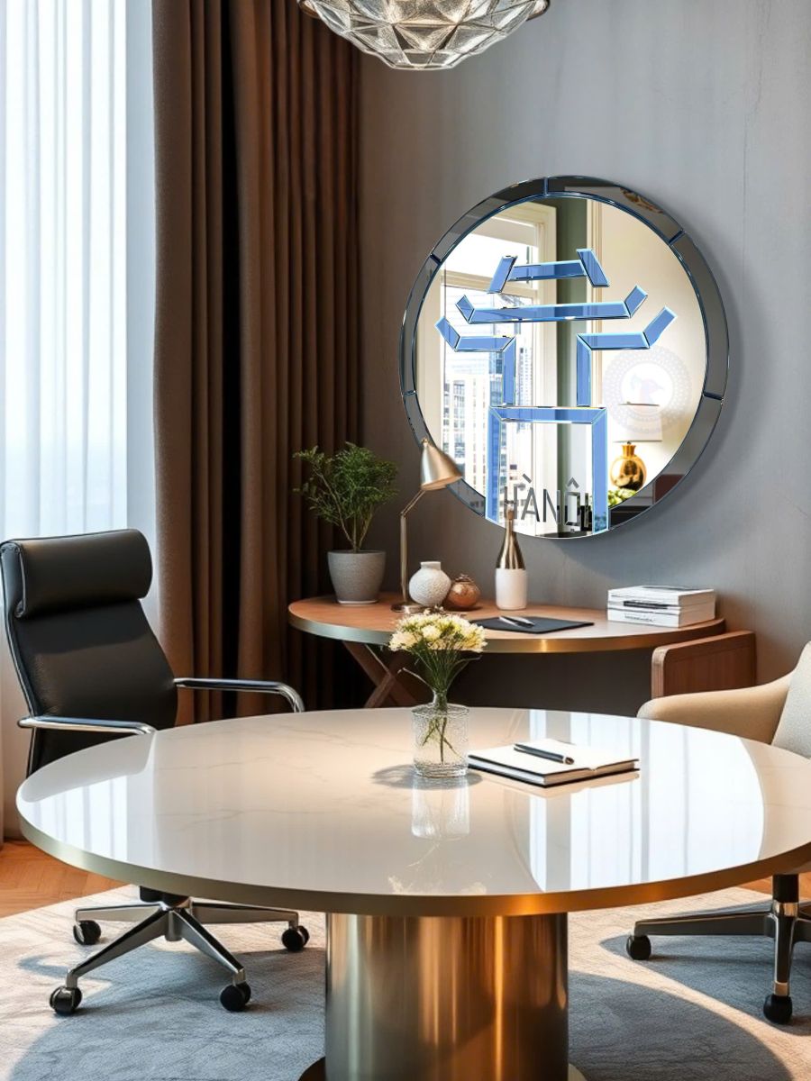 In terms of functionality, this mirror goes beyond its practical use for reflection, acting as an artistic piece that elevates the aesthetic of the space. It can be hung on the wall above a sofa or headboard, serving as a focal point in the room while creating an illusion of more space through its light-reflecting properties. The dominant colors—black, blue, and gold—create a striking yet harmonious contrast, effortlessly complementing other room elements like a deep blue sofa, a white coffee table, and decorative accessories such as flower vases or wall lamps.