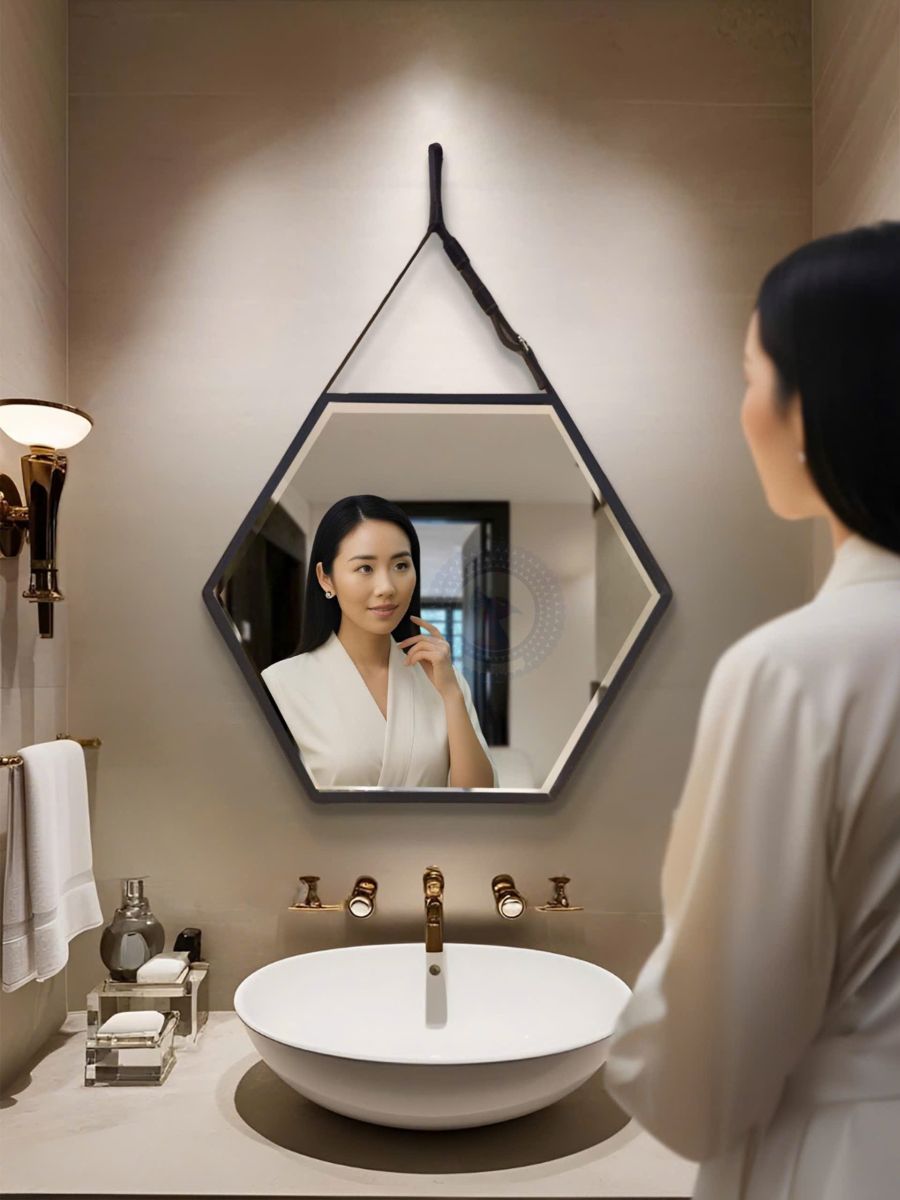 The Hexagonal Hanging Wall Mirror For Hotel Bathroom Projects NAV 905C adds a striking architectural element to your décor. With its six-sided frame and minimalist black border, this mirror turns a functional necessity into a modern sculpture. Suspended by a sleek strap, it floats elegantly above vanities, console tables, or entryways, giving any space an elevated designer look.