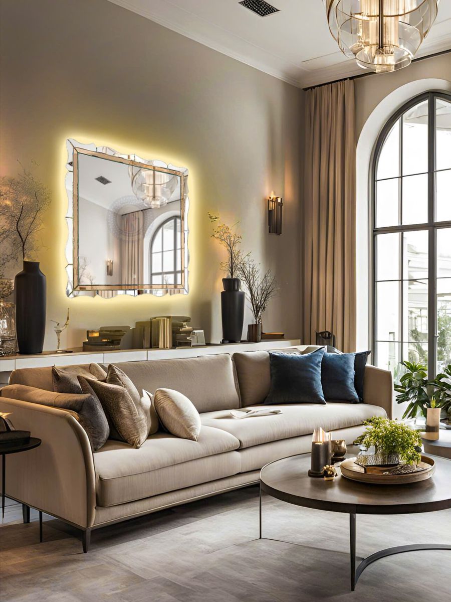 Artistic LED Mirror For Hotel Bedroom Project Anna NAV 6002B brings modern elegance into your space with its softly contoured square form and ambient backlighting. Its organic edge design subtly contrasts with the symmetrical square shape, offering a sophisticated balance between geometry and fluidity.