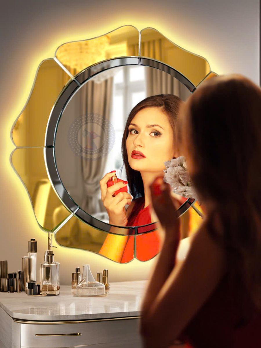 Inspired by the delicate shape of a blooming flower, Artistic LED Mirror For Hotel Bedroom Project Gerber NAV 6001 is a luminous centerpiece that exudes grace and innovation. This mirror is framed with gold-tinted petals radiating around a central circular pane, enhanced by integrated warm LED lighting that casts a soft, ambient glow.