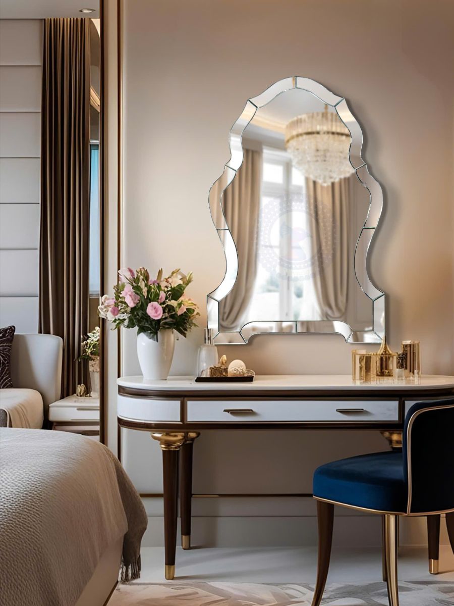 The Artistic Bathroom Decoration Mirror NAV 2087 For Hotel Bathroom Projects reimagines traditional silhouette mirrors with sweeping curves and scalloped contours, bordered by precision-cut mirrored segments. Its fluid lines evoke the grace of flowing fabric or the contours of a Baroque frame, making it a poetic centerpiece for sophisticated interiors.
