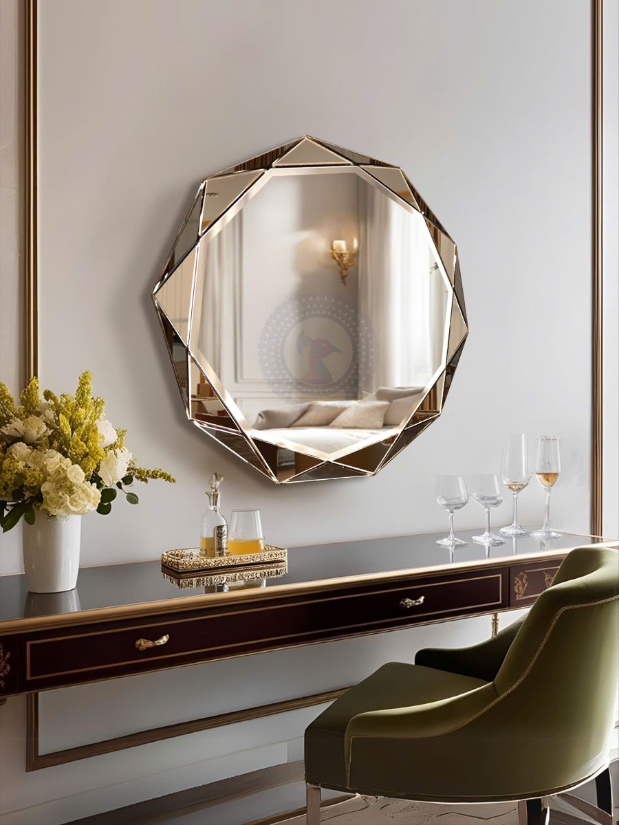 Crafted with meticulously beveled panels, the mirror creates a dimensional frame that mimics the structure of fine-cut crystal. Its design not only reflects light but enhances spatial dynamics — perfect above consoles, vanities, or statement walls.