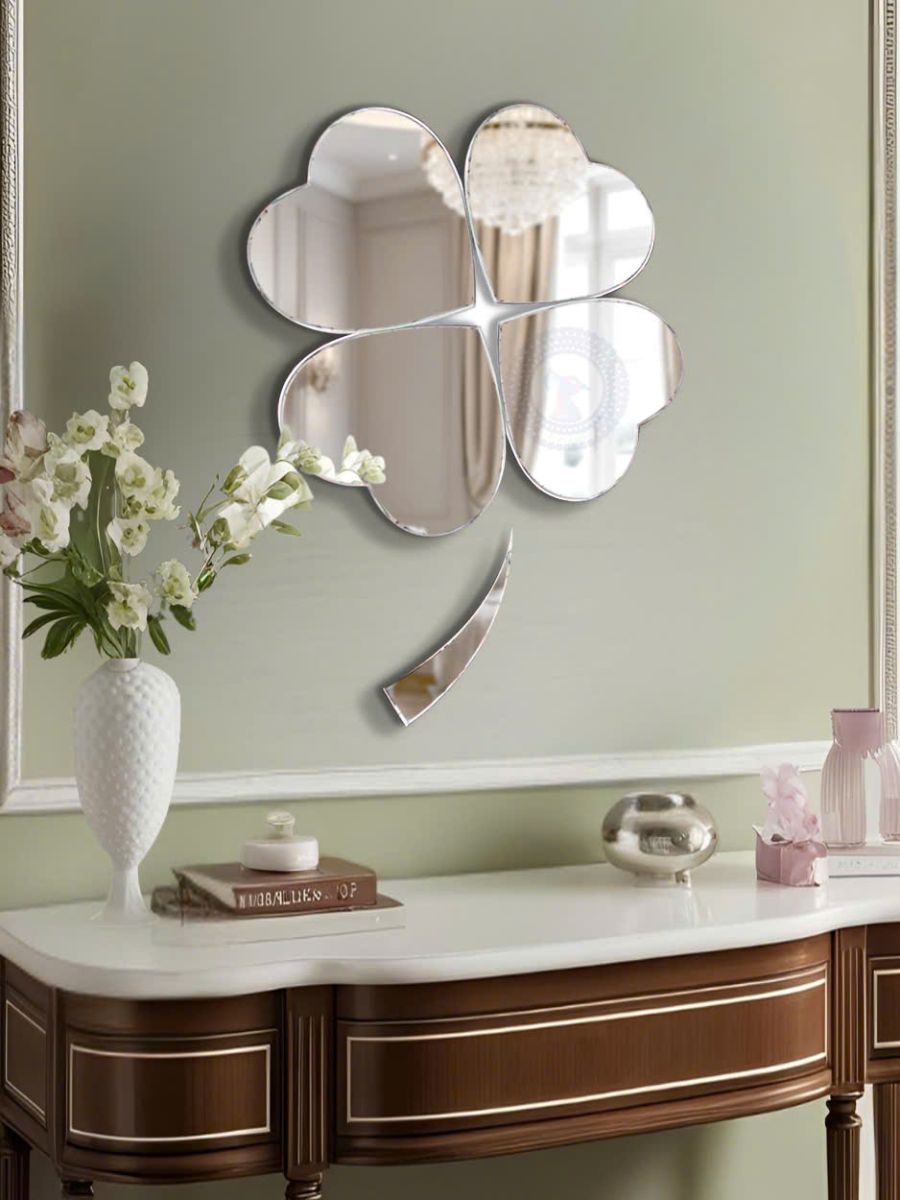 Celebrate harmony, hope, and good fortune with the Artistic Four-Leaf Vanity Mirror NAV 2140 For Hotel Bedroom Projects. This whimsical wall mirror takes the iconic shape of a four-leaf clover, reimagined in polished mirrored glass with smooth, rounded contours. Its distinctive stem completes the design, making it feel as though it bloomed right onto your wall.