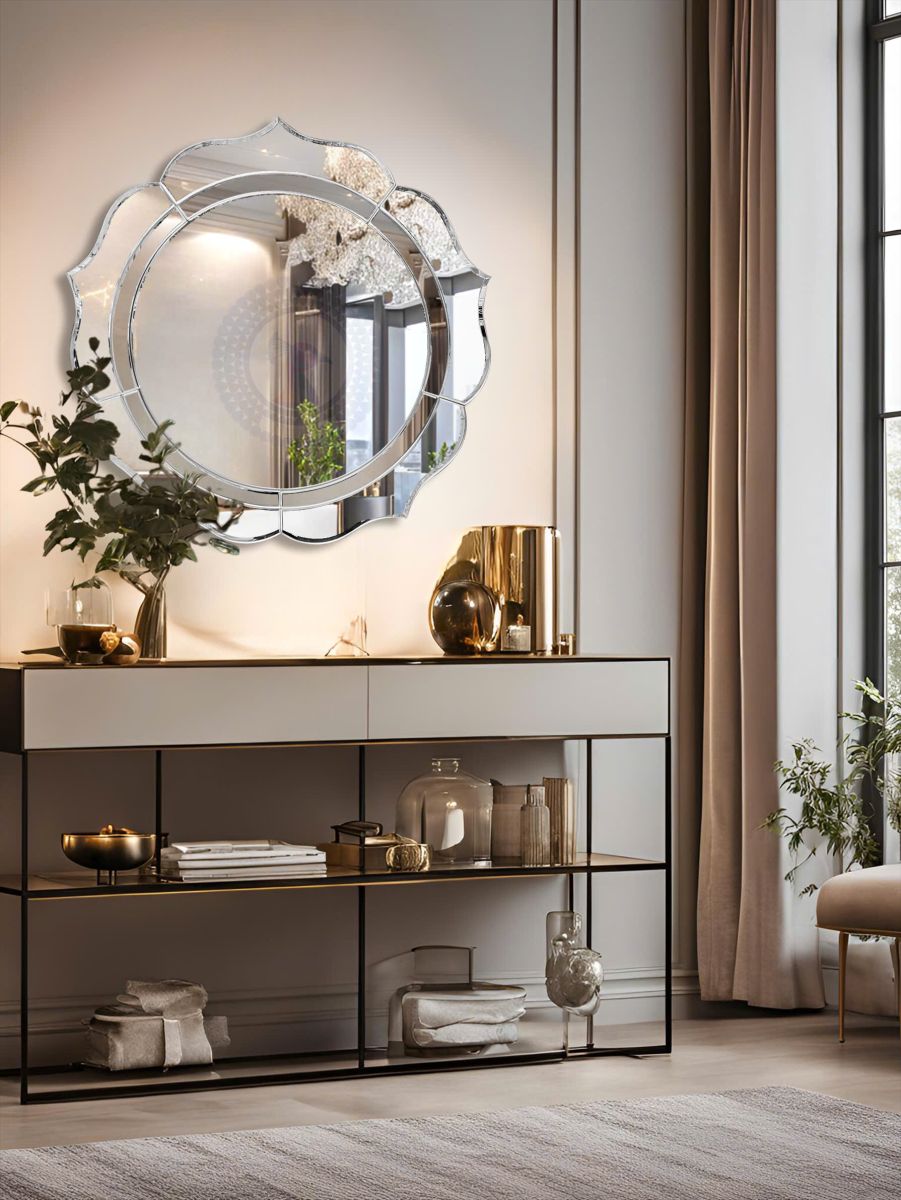 Crafted with precision beveled glass panels, Anna’s intricate petal-shaped form evokes harmony and sophistication. The center round mirror is surrounded by a mirrored border that adds depth and shine, making the piece both functional and artistic.