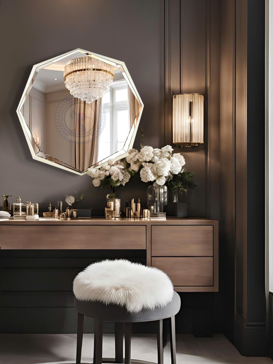 With a sculptural silhouette and expertly crafted mirrored frame, this octagonal design is both modern and timeless. It transforms a simple wall into a curated visual feature, whether placed in a boutique hotel suite, luxury powder room, or residential dressing area.