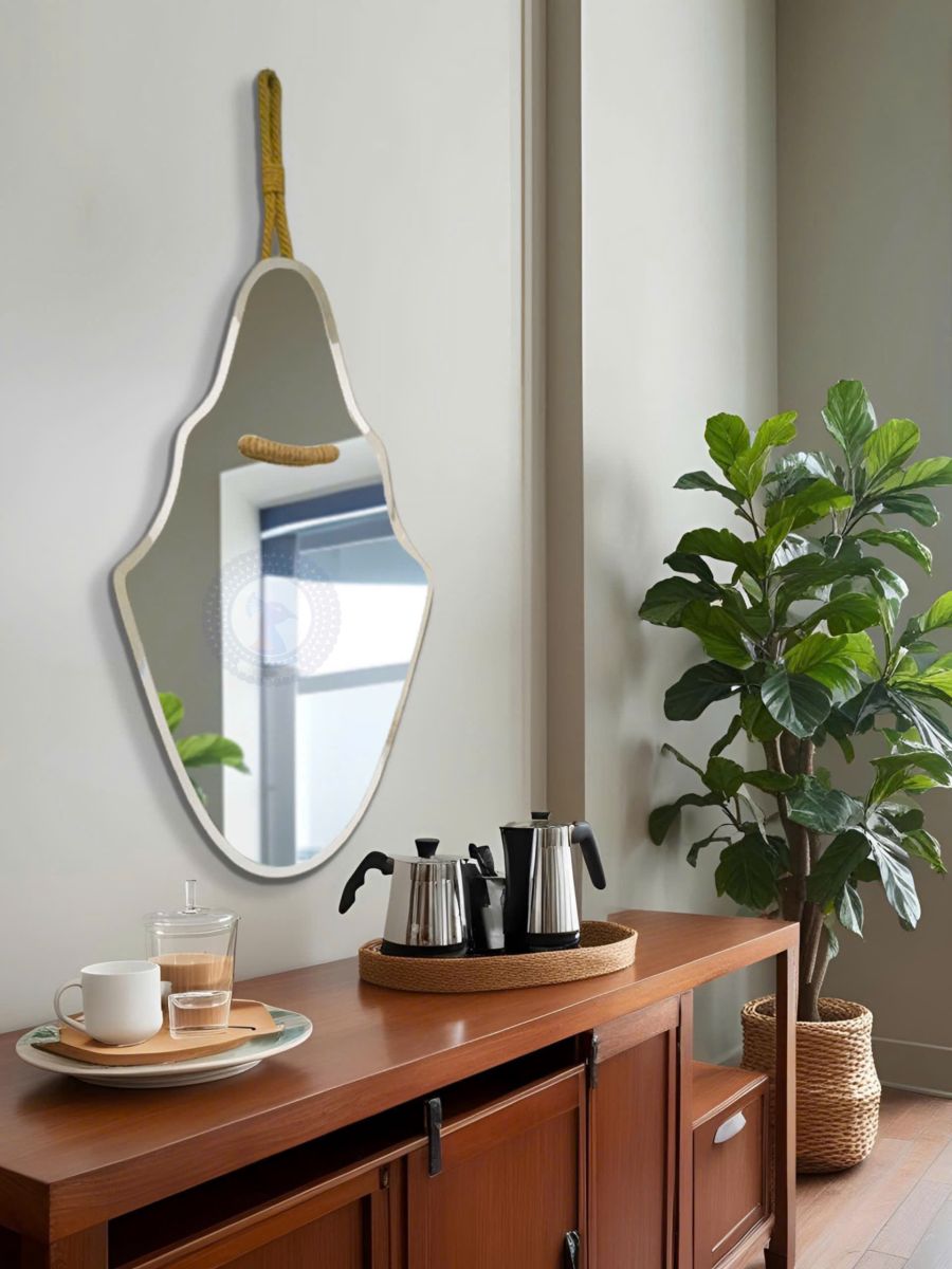 The Artistic Vanity Mirror Hilton NAV 304 For Hotel Livingroom Projects is a celebration of relaxed luxury and artisanal design. Its softly curved, asymmetrical form draws inspiration from organic shapes found in nature, while the suspended rope adds a charming, tactile contrast to its reflective elegance. This mirror doesn’t just hang on the wall — it makes a statement.